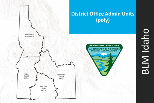 Description: This data set shows the Idaho BLM District boundaries and names as per the Organization Refinement for FY 2004, which became official on October 1, 2003 (FY04), plus subsequent edits. This dataset has been updated over time. A Bureau of Land Management (BLM) Administrative Unit is a geographic area in which an organizational unit of the BLM has distinct jurisdictional responsibility for land and resource management activities occurring on the public lands, the maintained rights of the United States (i.e. mineral estate) and actions relating to the Trust responsibilities of the U.S. Government as stipulated in Law or Treaty. District Offices are the middle tier of BLM's three-tier organization, providing coordination, oversight and support to the lowest level, the Field Office, and overseen by the State Office.
